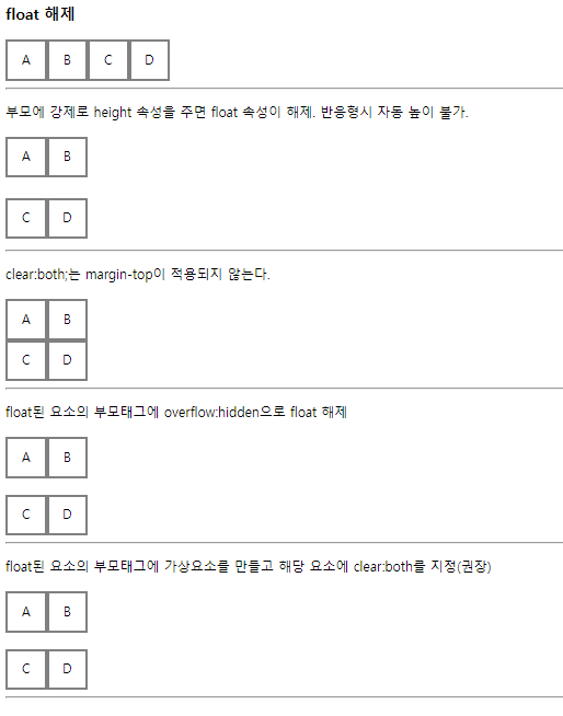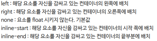 <p> float๋ ์์์ ๋ถ๋ชจํ๊ทธ์ ๊ฐ์์์๋ฅผ ๋ง๋ค๊ณ ํด๋น ์์์ clear:both๋ฅผ ์ง์ (๊ถ์ฅ) </p>