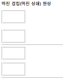 - ๋ง์ง ๊ฒน์นจ์ ๋ง์ผ๋ ค๋ฉด ๋ถ๋ชจ ๋ฐ์ค ์๋จ(ํ๋จ)์ padding ๋๋ border ๊ฐ์ ์ฃผ์ด ๋ฒฝ์ ๋ง๋ค์ด์ฃผ๋ ๊ฒ์ด ์์